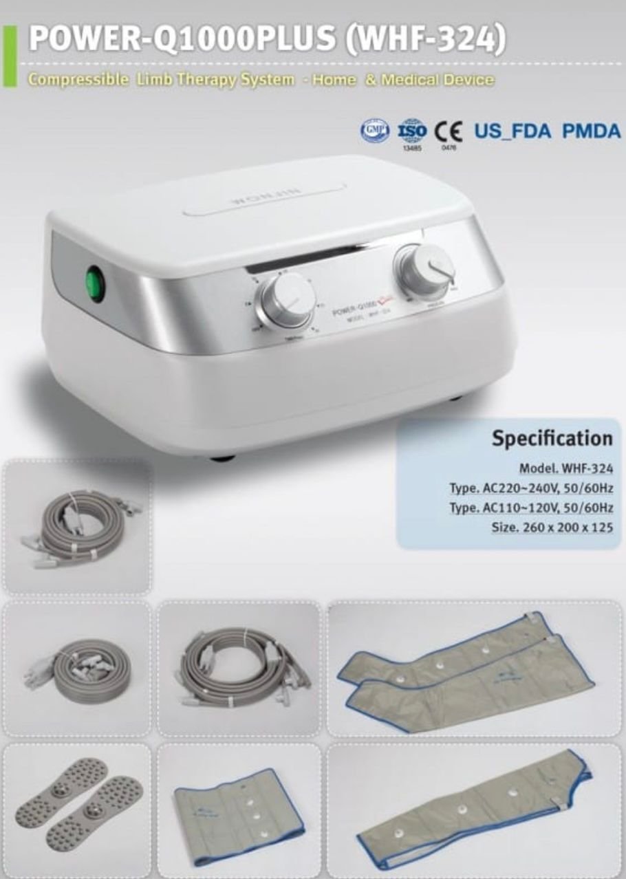 جهاز Power-Q1000 للتدليك الهوائي وعلاج الوذمة اللمفية. يساعد على تحسين الدورة الدموية والليمفاوية، تخفيف الألم والتورم في الأطراف، والوقاية من أمراض الأوعية الدموية. مثالي للاستخدام المنزلي والعيادات.